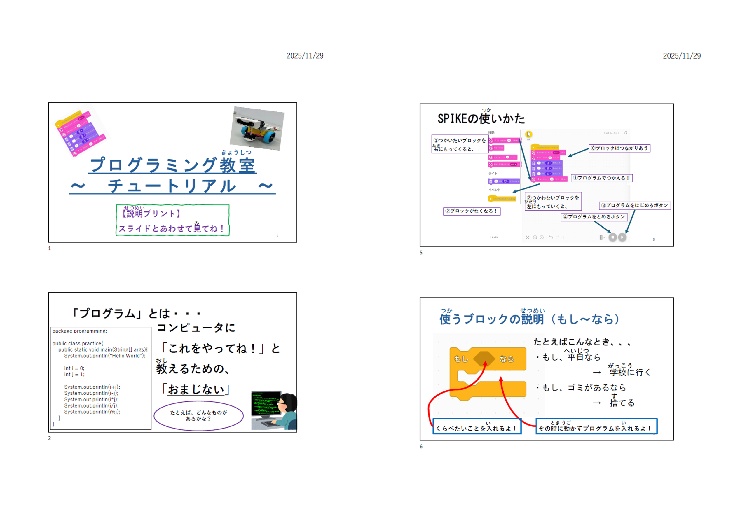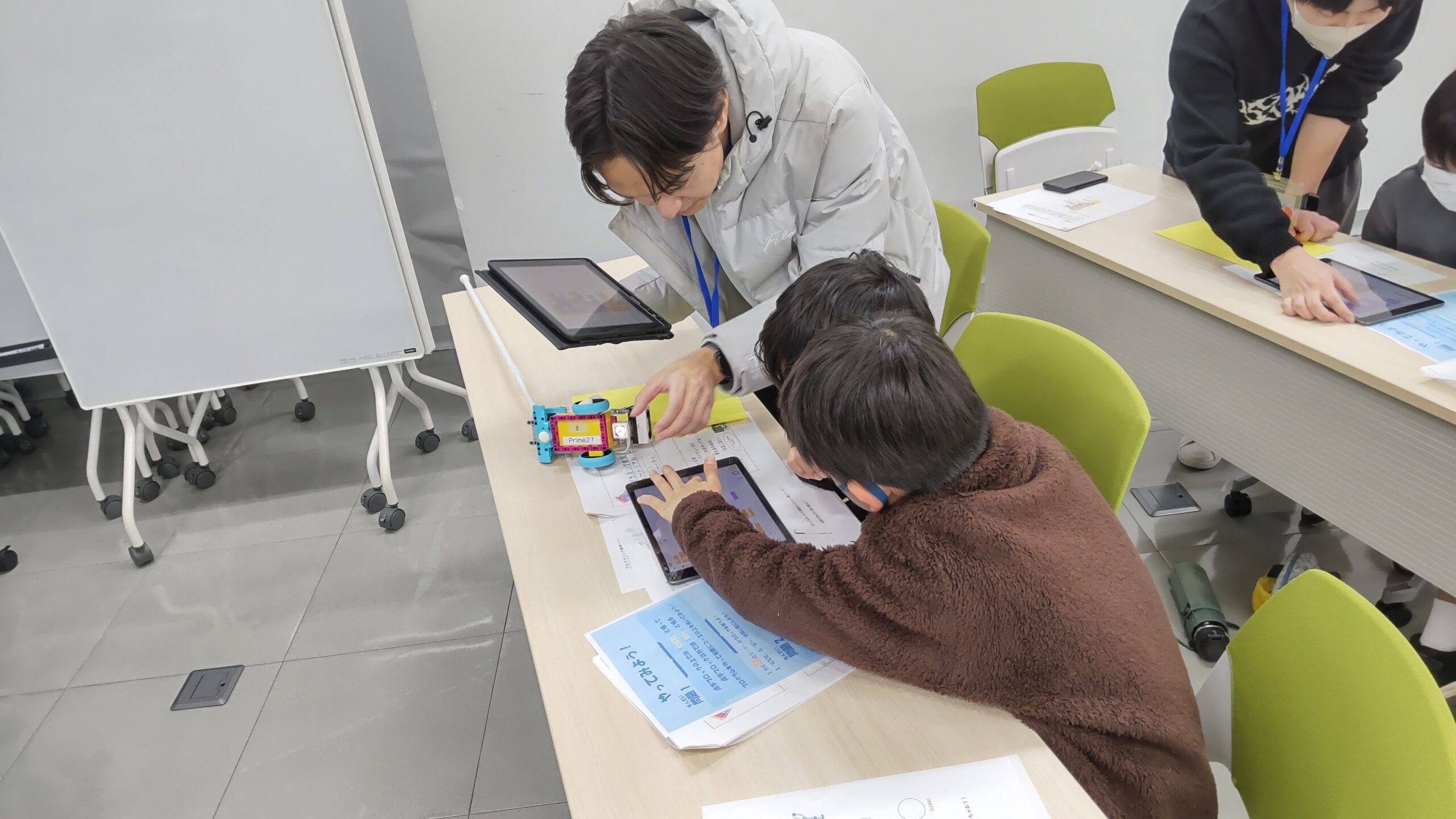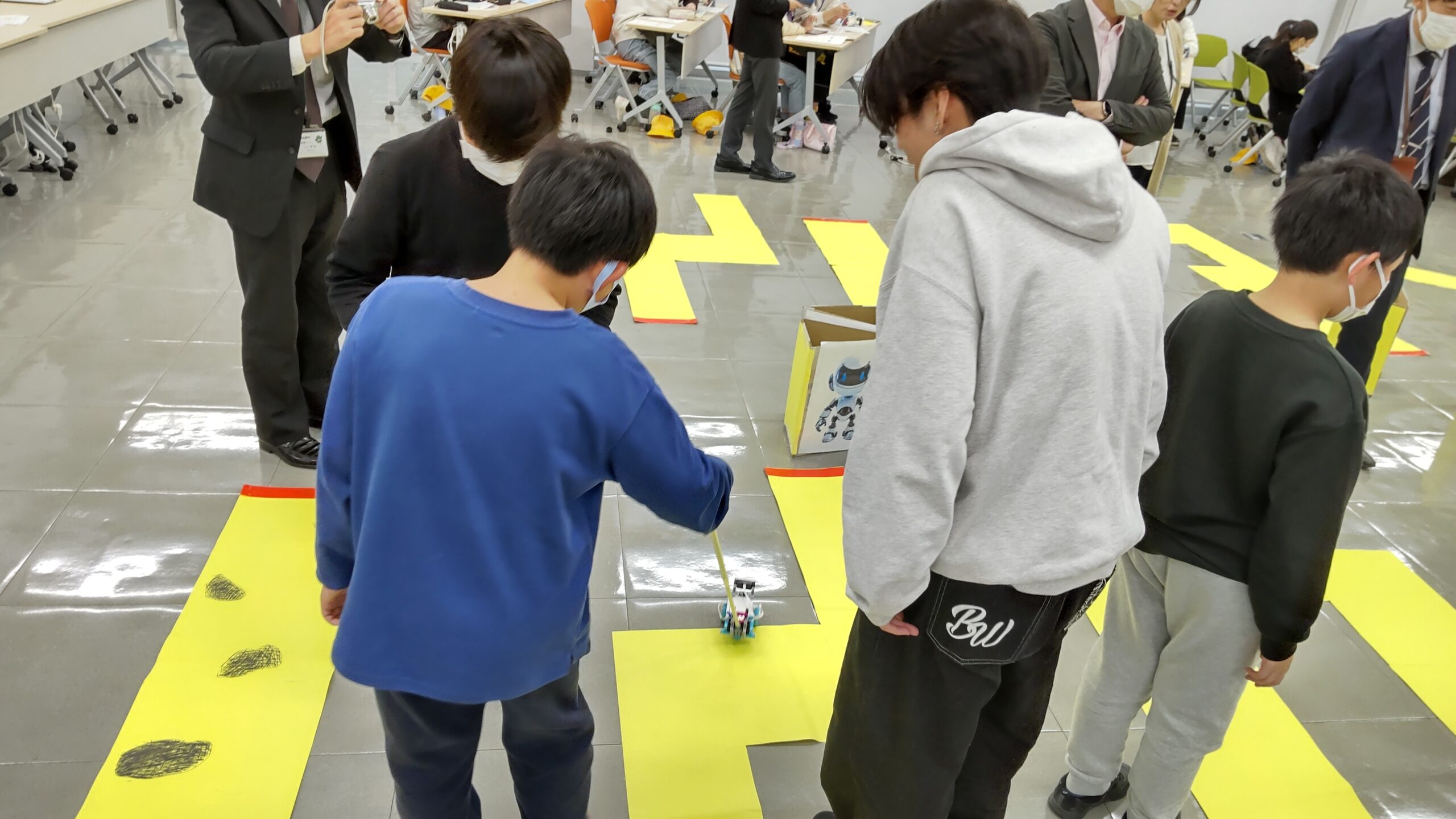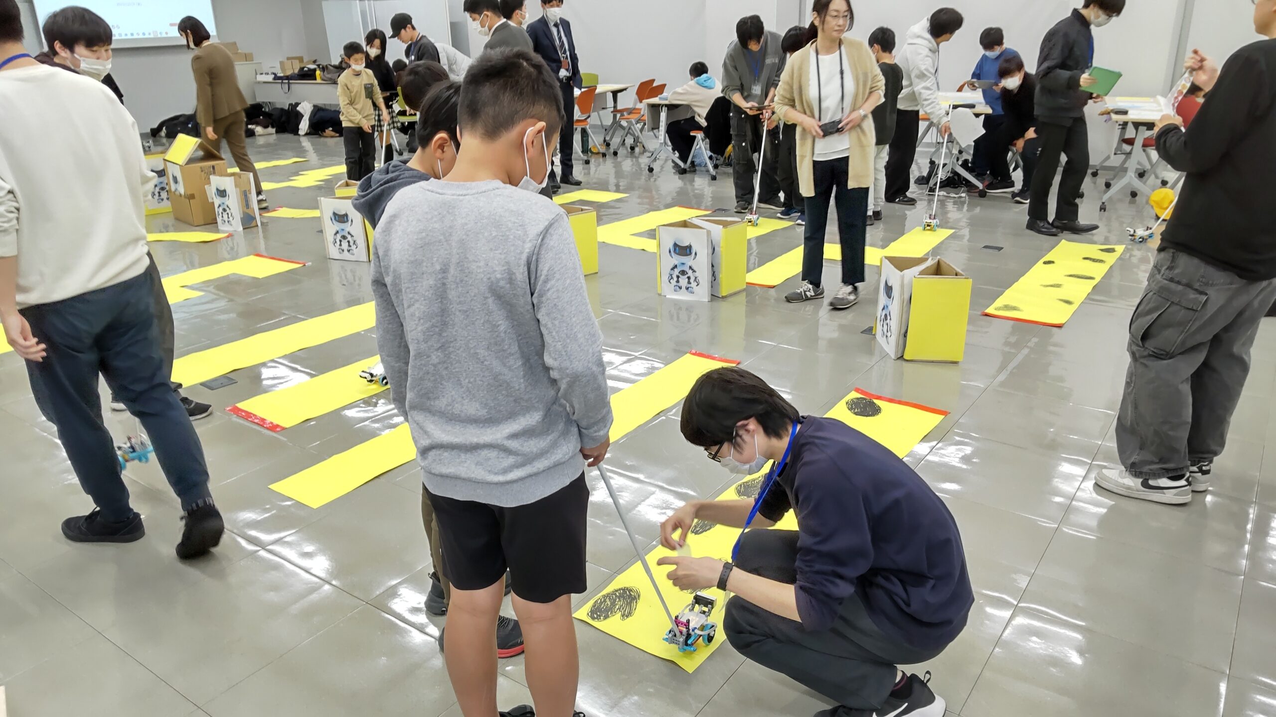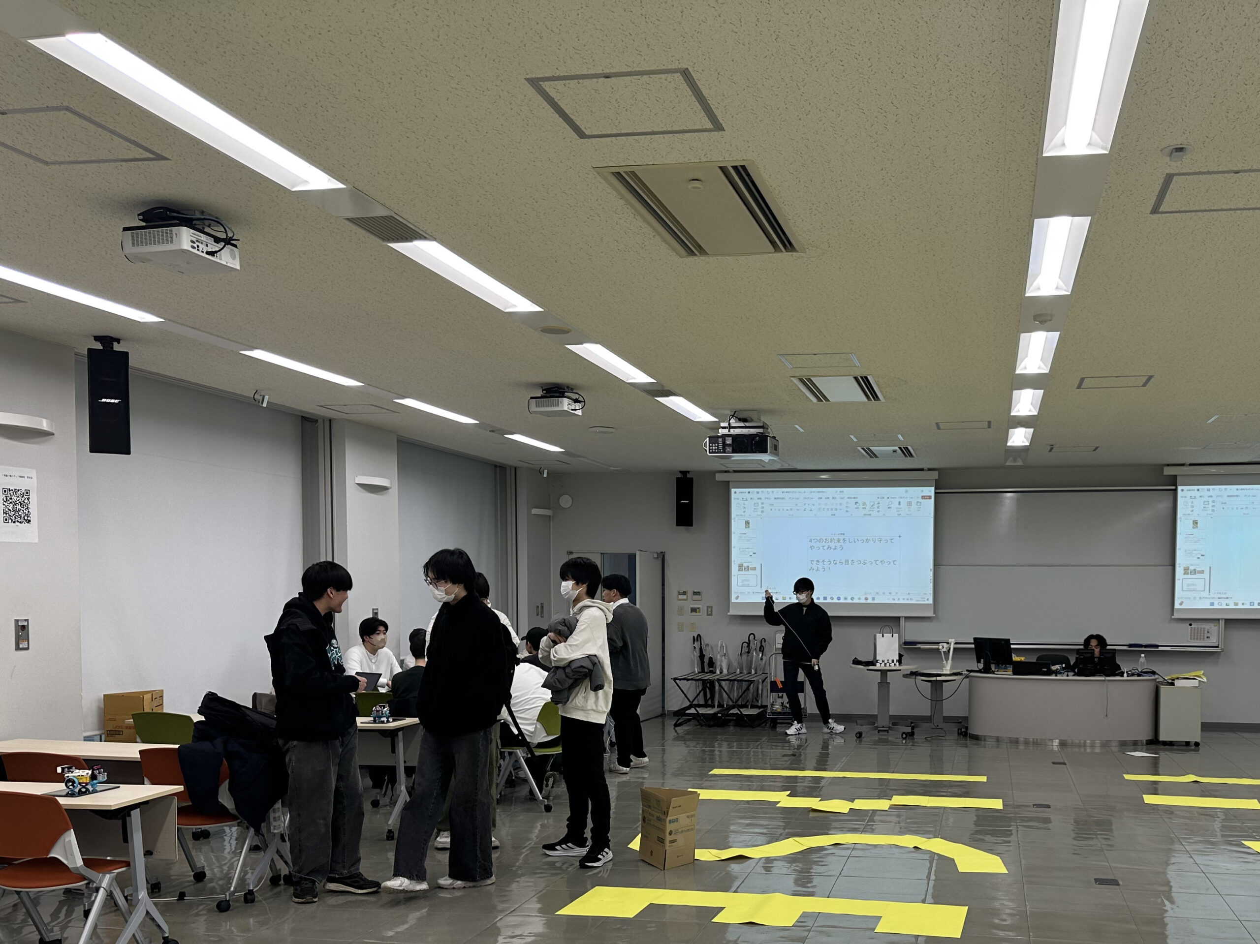 2025年のテーマは受講する小学校での学習内容も踏まえ、「白杖ロボットを動かす、プログラミング教室」。國宗先生、高橋先生の研究室で卒業研究を行うための第一歩としても位置づけられています。